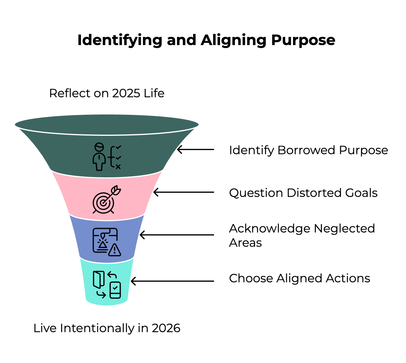 “I’m reviewing my year through the lens of borrowed versus chosen purpose, including purpose that started as mine but may have grown distorted. Here’s how I typically spend my weeks: [describe your commitments, energy patterns, and which activities leave you feeling more vs less like yourself]. Help me identify: 1) Which commitments seem genuinely aligned with my values versus maintained out of obligation, guilt, or habit, 2) Which of my OWN goals might have scaled beyond what’s healthy or sustainable, 3) Who or what is being neglected while I pursue these things, and 4) One small, aligned action I might experiment with, something that looks smaller than my ego would prefer but feels unmistakably like me. Be honest, I’d rather see clearly than feel comfortable.”