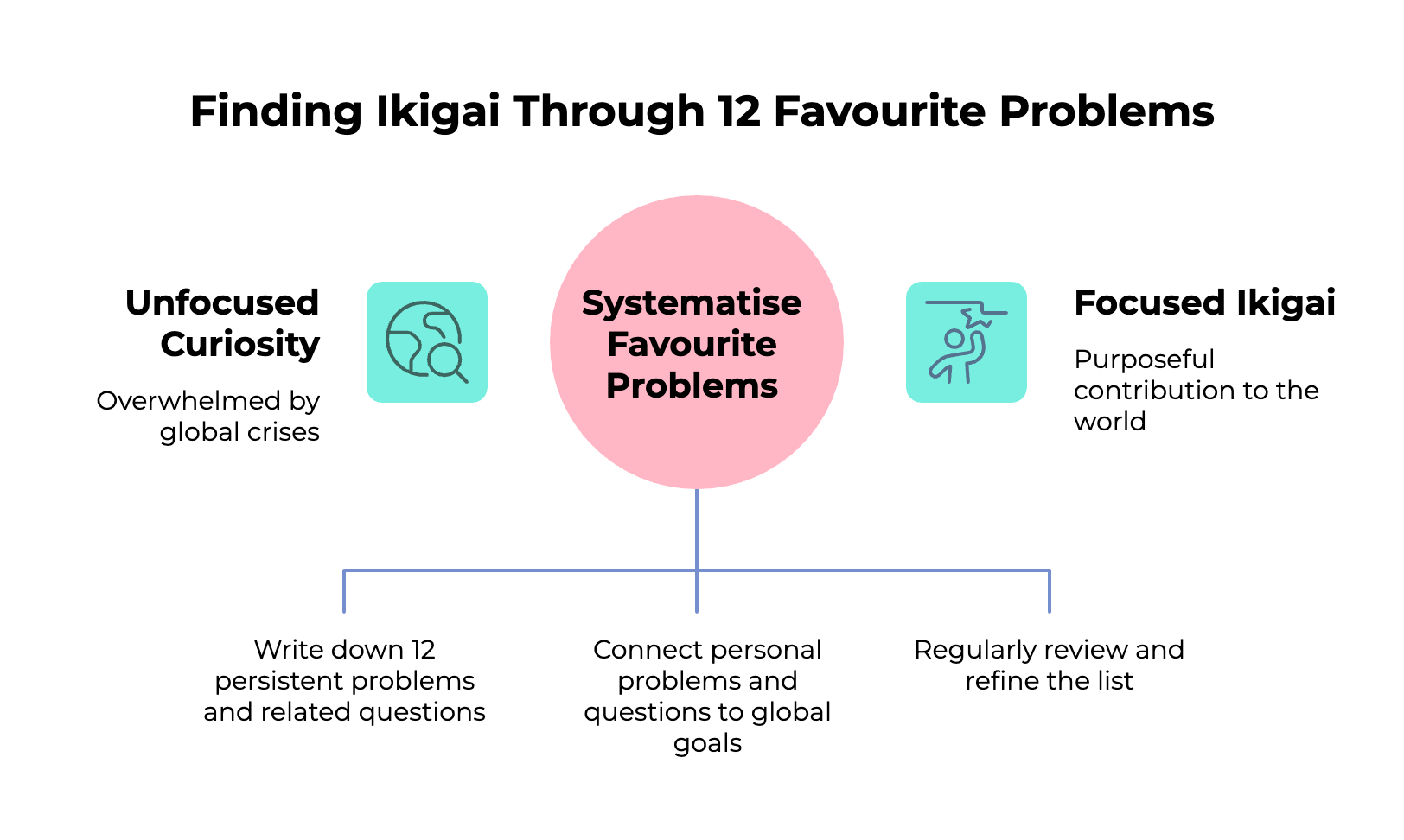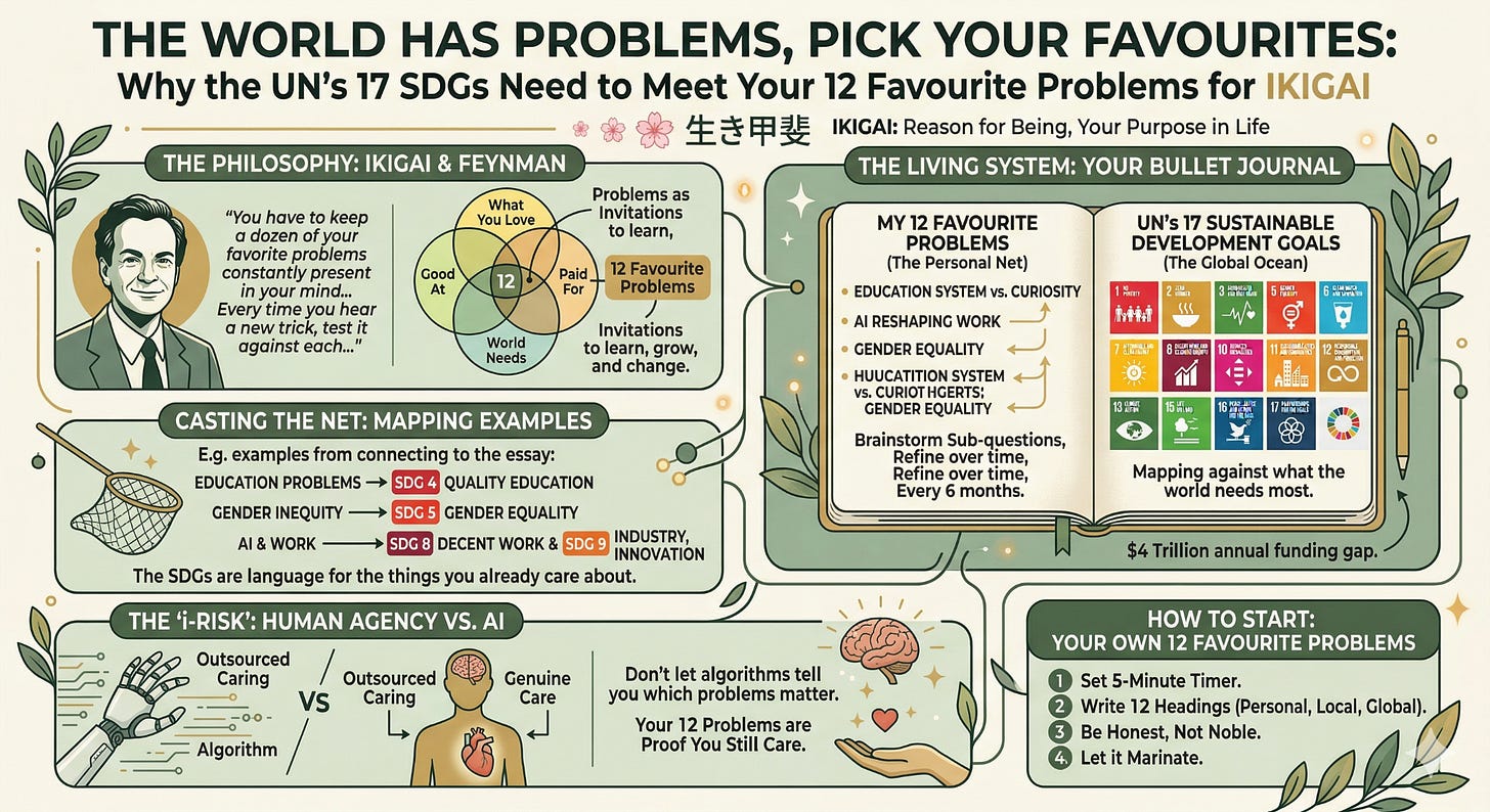 This matters for the bigger picture. If you’ve been following the hatarakigai thread, you know there are four aspects to ‘work worth doing’; what you love, what you’re good at, what the world needs and what you can be paid for. Your twelve favourite problems are the most powerful way I’ve found to fill in that third circle... “what the world needs”... with something real and personal rather than vague and overwhelming… and once that circle has your name on it, it starts talking to the others. What you’re good at gets sharper because you’re practising on problems you care about. What you love becomes clearer because you’re following genuine curiosity, not obligation. Even the money circle starts making more sense when you know what specific value you’re bringing. The twelve favourite problems don’t just feed hatarakigai. They feed your whole ikigai.