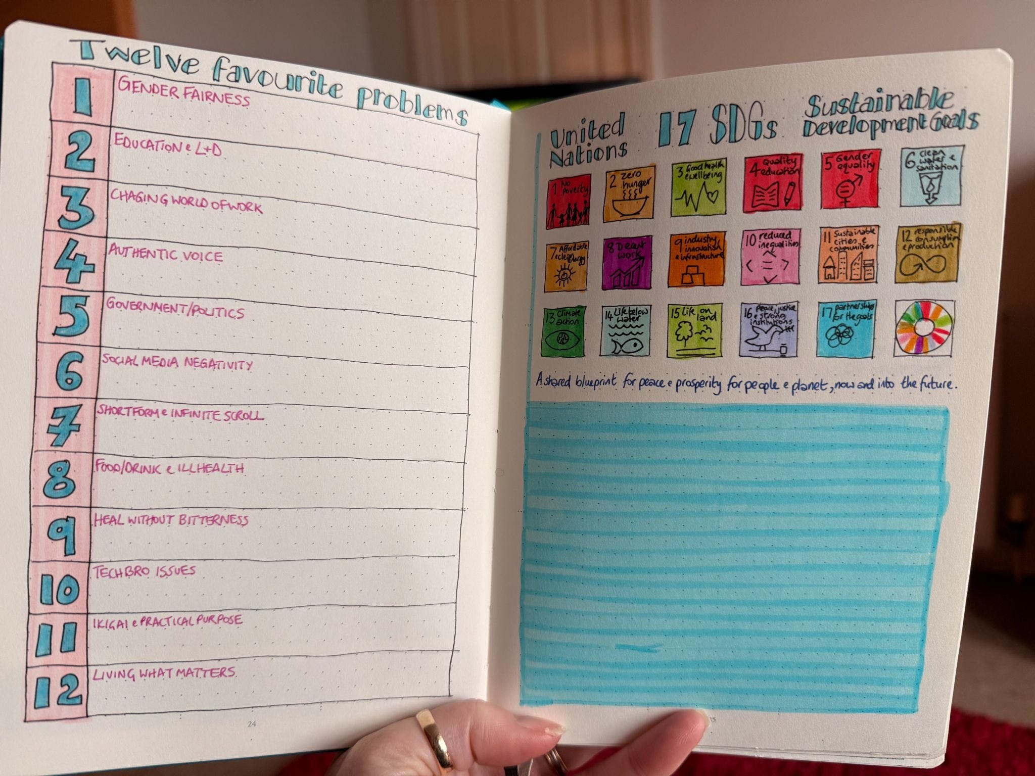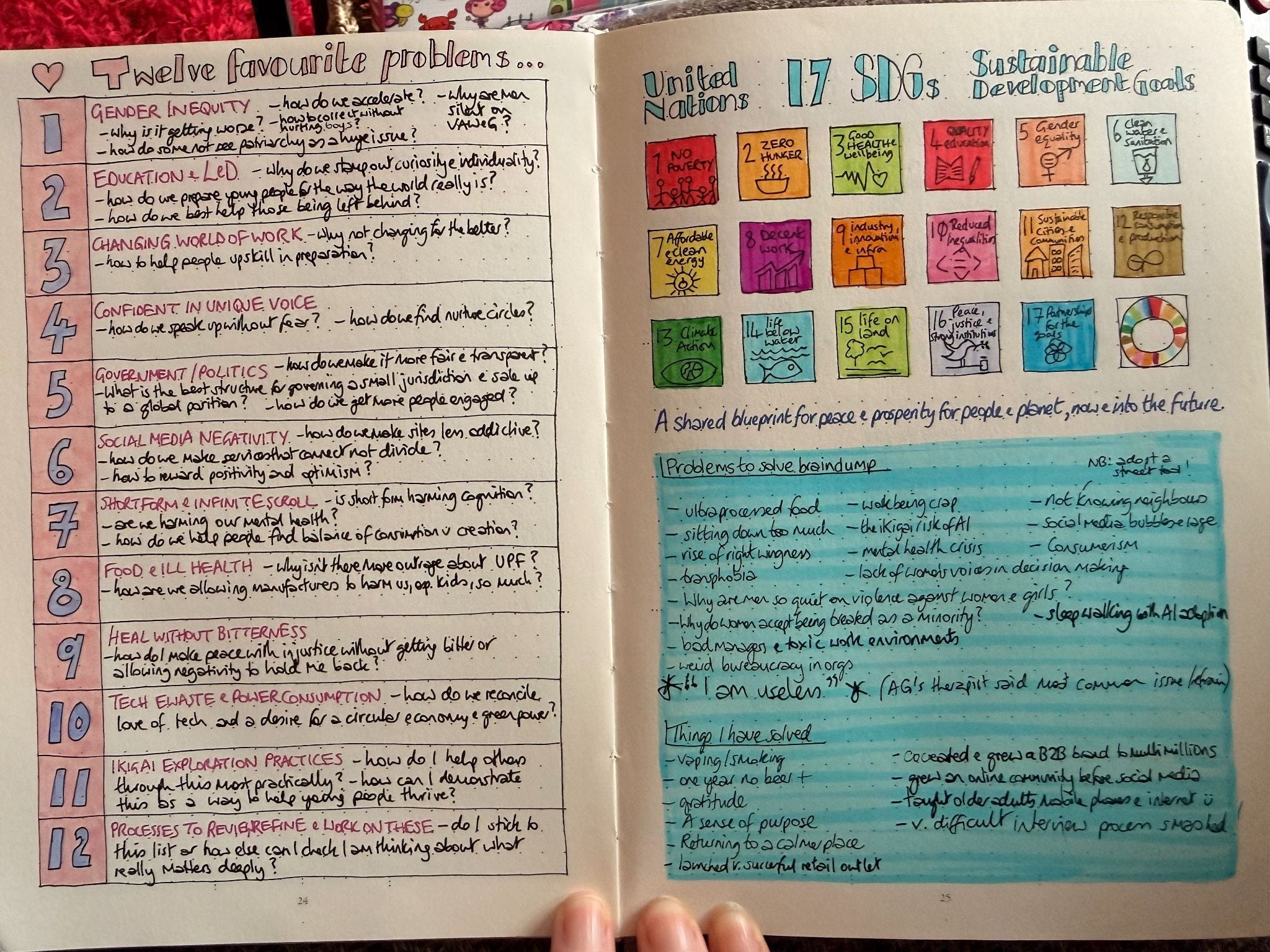 Having them right there, opposite my twelve problems, does something powerful. It frames my personal questions within the context of what the world really needs the most. The world’s problems can feel too big to hold, hard to feel a personal ‘spark’ for a bullet point on a PDF in Geneva… but when you map your own curiosities against them, the apathy of scale turns into the energy of choice. It also reminds me that there is a $4 trillion annual gap in funding for these global goals, aside from being the right things to do there is also a massive opportunity for anyone brave enough to pick up a ‘favourite problem’ and run with it.