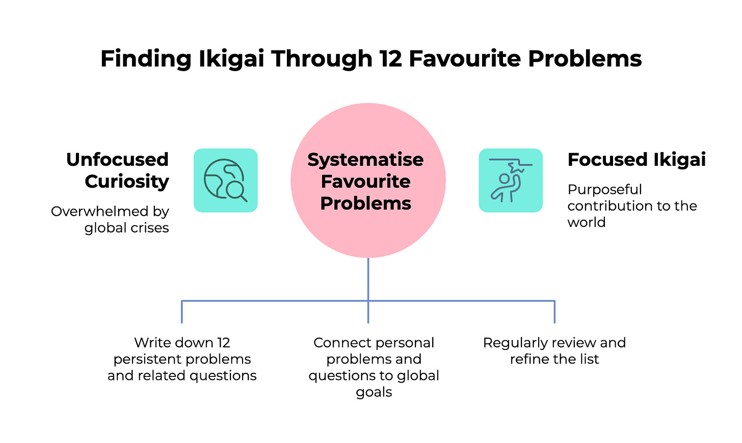 If you want to try this yourself, the PS below has the full journal process and the PPS has an AI prompt that might help you surface problems you didn’t know you were already carrying. But the short version? Get a rough book or blank piece of paper, write “My 12 favourite problems” at the top, set a timer for 5 minutes and just write what comes to your mind first. Start with the headings if easier. Just twelve things you can’t stop thinking about, try to balance some on a personal scale, some a local scale and some a global scale. Don’t try too hard or think too long, this isn’t about who can be the most noble. The world won’t be helped by you listing the most impressive problems you can think of. It needs your most honest ones, the ones you won’t get bored thinking about or working on.
